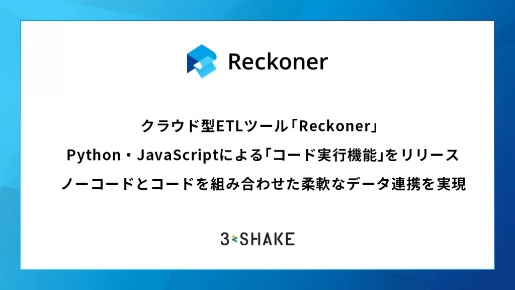 株式会社スリーシェイク(本社:東京都中央区、代表取締役社長:吉田 拓真、以下スリーシェイク)が提供するクラウド型データ連携ツール「Reckoner(レコナー)」は、データ連携フロー内でPythonおよびJavaScriptのコードを記述し、独自のデータ処理を実装できるコード実行機能をリリースしたことをお知らせします。本機能により、GUIベースのノーコード操作によるデータ連携に加え、コードによるカスタム処理を組み合わせた柔軟なデータ連携が可能になります。