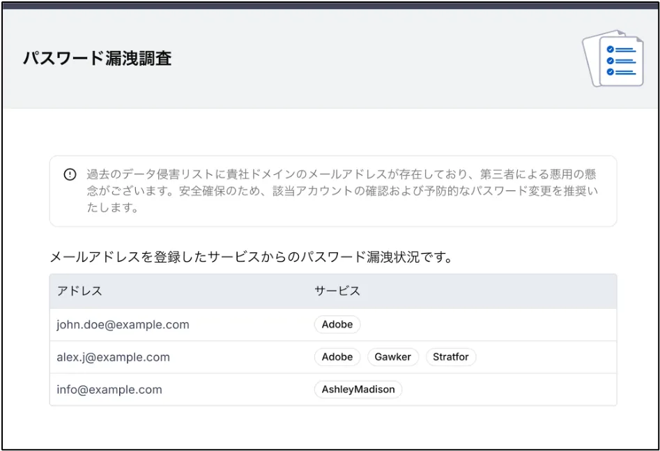 本サービスは、企業ドメインを起点に、インターネット上に公開・登録されているメールアドレスの状況と、過去に発生したデータ侵害(データブリーチ)における漏洩の有無を調査・報告するサービスです。